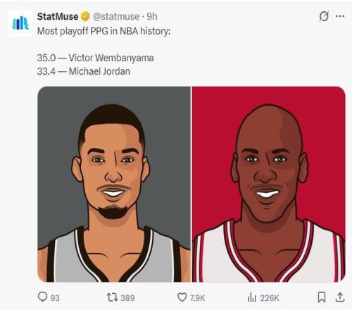 因為22歲的文班亞馬首場季后賽就如此爆炸,數據媒體StatMuse用喬丹調侃他,數媒寫道:文班亞馬首秀35分,喬丹季后賽場均33.4分不及文班。