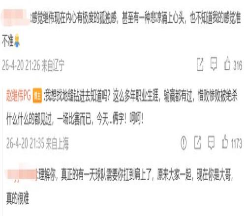 心疼繼偉的遼寧球迷在評論區(qū)表示:感覺繼偉現(xiàn)在內心有極度的孤獨感,甚至有一種悲涼涌上心頭,也不知道我的感覺準不準?這條評論得到了趙繼偉的回復;接下來繼偉說了一段直抒胸臆也耐人尋味的心里話: