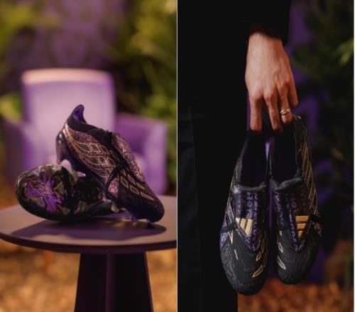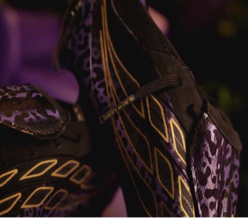卡卡專屬簽名款PREDATOR戰(zhàn)靴以黑色為主色調(diào),鞋面飾有隨光影流轉(zhuǎn)的幻彩美洲豹印花,呈現(xiàn)深邃紫與暗調(diào)的漸變效果。鞋身外側(cè)飾有標(biāo)志性三條紋并搭配金色細(xì)節(jié),提升整體質(zhì)感。鞋身多處融入卡卡專屬簽名標(biāo)識(shí)與文字元素,其中鞋帶頂端更暗藏他職業(yè)生涯關(guān)鍵球場(chǎng)的坐標(biāo)——圣保羅莫倫比球場(chǎng)、米蘭圣西羅球場(chǎng)、馬德里圣地亞哥·伯納烏球場(chǎng)以及奧蘭多Inter&Co球場(chǎng)。這一細(xì)節(jié)為戰(zhàn)靴賦予了獨(dú)一無(wú)二的個(gè)人敘事,將戰(zhàn)靴與卡卡的職業(yè)生涯歷程深度聯(lián)結(jié)。