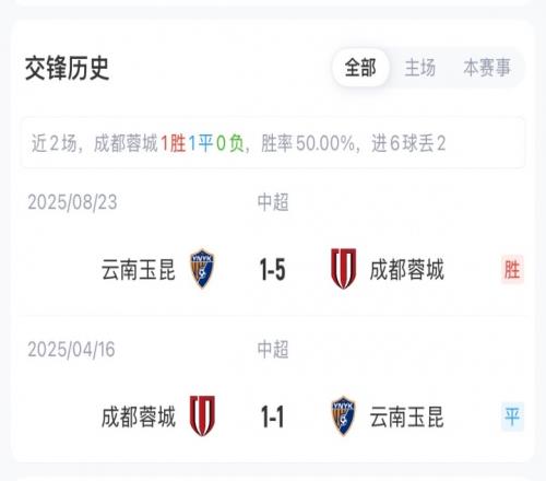 積分榜方面,蓉城前6輪5勝1平,積16分高居聯賽榜首;玉昆則是3勝3負,積9分排在第4。