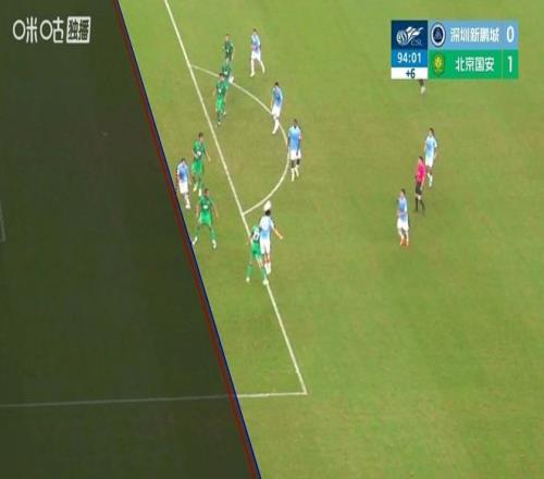 補時階段,深圳新鵬城長傳入禁區,周定洋挑射擊中立柱彈出,夏合扎提補射破門,但VAR介入后認定周定洋越位在先進球無效。