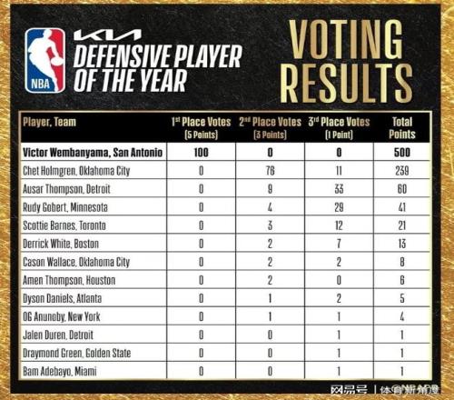 今年DPOY的三位候選人分別是文班亞馬、霍姆格倫以及奧薩爾 - 湯普森。NBA常規(guī)賽的DPOY評(píng)選,是由100名媒體記者組成的投票小組負(fù)責(zé)的,每位記者擁有3張選票,依次為第一、第二、第三選票,其分值分別為5分、3分、1分。亞馬,憑借全部100張第一選票,豪取500分。整體投票情況如下(此處可簡(jiǎn)單提及或省略具體投票分布,保持與前文銜接)。不過,這一結(jié)果完全在大家的意料一切都是順理成章。文班亞馬此前接受采訪時(shí)就自信滿滿地表示:“要是不能全票當(dāng)選,我肯定會(huì)大吃一驚。全票,必須全票!”