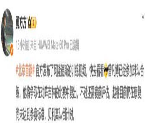 日前,京媒記者勇方方報道,曾凡博已經參加球隊合練,他將會爭取在收官戰對陣吉林的比賽中復出,但趙睿目前仍在康復,尚未達到參賽標準。