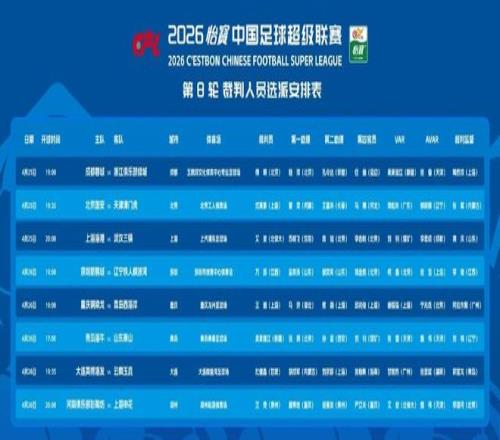 北京時間4月25日,2026賽季中超聯賽第8輪比賽將于今晚打響。剛剛,本輪比賽裁判選派結果出爐,沈寅豪將執哨京津德比,傅明則吹成都蓉城戰浙江隊,艾堃迎來賽季中超首秀。