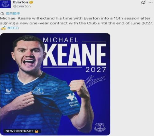 官方:埃弗頓宣布邁克爾-基恩續簽了一年合同,這名中衛的新合同2027年到期。