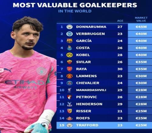 《轉會市場》統計了當前門將身價排名前15球員,曼城一門多納魯馬居首。德轉列門將身價榜:歐元