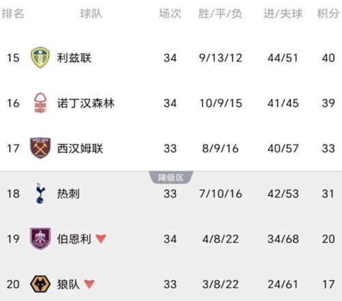 從目前來看,西漢姆和熱刺的情況最為兇險,這2支倫敦球隊已經被諾丁漢森林和利茲聯甩開了至少6分的差距,接下來西漢姆將在主場迎戰埃弗頓,熱刺則做客對陣狼隊,無論西漢姆還是熱刺,本輪比賽都非勝不可,否則的話,他們降級的可能性越來越大。特別是熱刺,已經連續15輪不勝的他們,本輪要是不能在客場拿下狼隊,對球隊將是重大打擊,在球員徹底失去自信心的情況下,熱刺隨時可能在英超首次降級。對于熱刺來講,接下來這場比賽的重要性,絲毫不亞于他們當年踢歐冠決賽,對陣狼隊贏球,不一定能幫熱刺走出降級區,但是不勝的話,就基本釘死在這個位置,下賽季只能去英冠爭冠了!