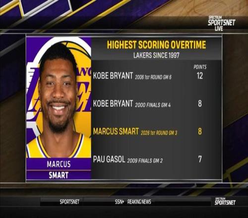 賽后根據統計,斯馬特此戰加時賽拿下8分也讓他成為了湖人隊自1997年以來,季后賽單場加時賽得分第二高的球員,僅次于2006年季后賽首輪G6加時賽砍下12分的科比。