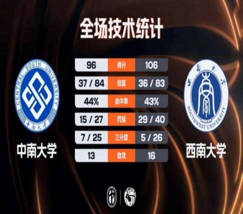 加時賽,兩隊打得依舊是難解難分,比分從91-91平一直僵持到96-96平,關鍵時刻中南大學突然不得分,羅松連續攻筐得分并打成3+1,西南大學連拿10分直接殺死比賽,最終西南大學加時力克中南大學。