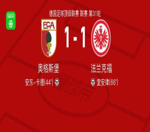 奧格斯堡11法蘭克福,安東卡德首開記錄,堂安律扳平 懂球帝 2026-04-26 09:56:16 北京時間4月25日德國足球頂級聯賽 聯賽 第31輪,奧格斯堡主場對陣法蘭克福。奧格斯堡安東-卡德破門。法蘭克福堂安律破門。最終比分奧格斯堡 1-1 法蘭克福。精彩瞬間第44分鐘,奧格斯堡球員安東-卡德打入一球。第66分鐘,法蘭克福球員詹-烏尊助攻堂安律打入一球。球隊陣容 技術統計 堂安律免費觀看_法蘭克福免費觀看_奧格斯堡隊免費觀看_堂安律高清在線_法蘭克福高清在線_奧格斯堡隊高清在線 堂安律 法蘭克福 奧格斯堡隊 安東-卡德 上一篇: 阿米里:清楚球隊激怒了拜仁比賽說明了拜仁為何世界最強 下一篇: 巴薩本賽季聯賽替補已打入17球,五大聯賽僅次于拜仁