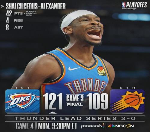 亞歷山大接管比賽,此役投籃18中15,三分3中1,罰球12中11,狂轟42分4籃板8助攻1搶斷,得分創(chuàng)個人季后賽生涯新高。其中有6個罰球,來自太陽最后的犯規(guī)戰(zhàn)術(shù)。今年季后賽首輪前三場已經(jīng)全部結(jié)束,僅雷霆和湖人取得3-0領(lǐng)先。