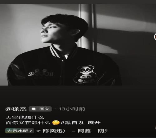 徐杰其實比較少更新個人社交媒體,而且一般不會直接說出自己的心里話,而是用比較婉轉的語言或者是引用名言來表達自己的心情和想法。昨天深夜徐杰更新社媒,曬出了自己的黑白帥照,配文:“天空他想什么,而你又在想什么。”