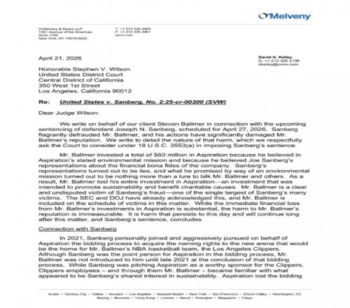 鮑爾默寫道:“五年前,我投資了一家專注于環境可持續發展的公司Aspiration,這項事業對我和我的家人來說是一項重要的使命。我還通過這家公司購買了碳信用額度和樹木,以減少快船、直覺穹頂球館、起亞論壇球館以及我們所有球迷和顧客的碳足跡。Aspiration的創始人喬·桑伯格參與了欺詐活動,傷害了許多人,最終導致公司倒閉。我被騙了,對此我感到很愚蠢。所有相信Aspiration的人,包括員工、客戶和投資者,也都被騙了。每個人仍在計算損失。以下是我在定于周一對喬·桑伯格進行量刑宣判前,提交給威爾遜法官的信件。”