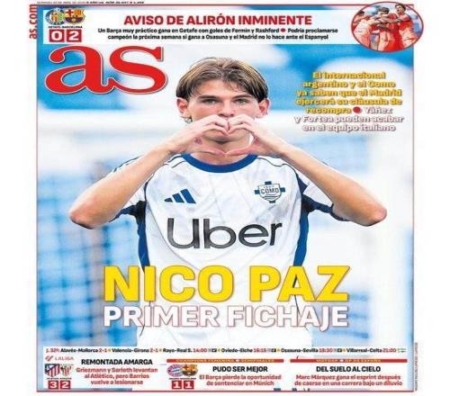 本周日,《阿斯》報以頭版頭條形式預告阿根廷中場天才尼科·帕斯回歸皇家馬德里的可能。據悉,皇馬方面已決定激活體育城青訓出身的帕斯回購條款,而在科莫練級有成的帕斯,似乎終于等到了伯納烏的垂青之日。