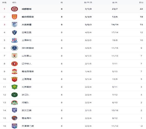 在積分榜上,成都蓉城排名榜首,戰績是7勝1平,拿到22分。重慶銅梁龍戰平之后,總積分是18分,排名第2。大連英博輸球之后,依然是15分,排名第3。云南玉昆4勝4負,拿到12分,排名第4。上海申花贏球之后,總積分是10分,升到了第5的位置。被扣掉10分的情況下,上海申花能夠這么快爬到這樣的位置,非常不容易。上海海港5分,排名第10。北京國安3分,排第11。浙江隊也是3分,排名第12。