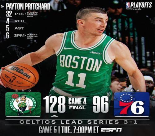 末節決戰,凱爾特人延續著進攻端的出色表現,并將分差擴大至30分以上,76人追分乏力,比賽早早失去了懸念。兩隊逐漸換上板凳席末端的球員,時間很快走完。最終,波士頓以128比96完勝費城,將大比分改寫為了3比1并就此奪下了賽點。雙方的G5對決,將在凱爾特人主場進行。