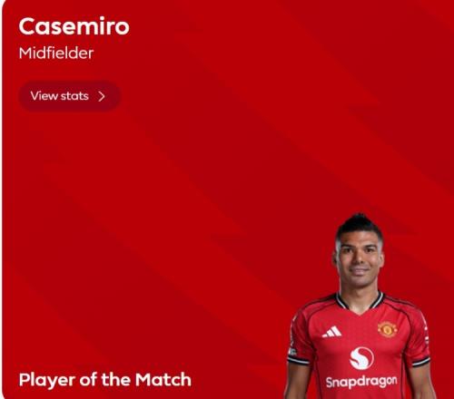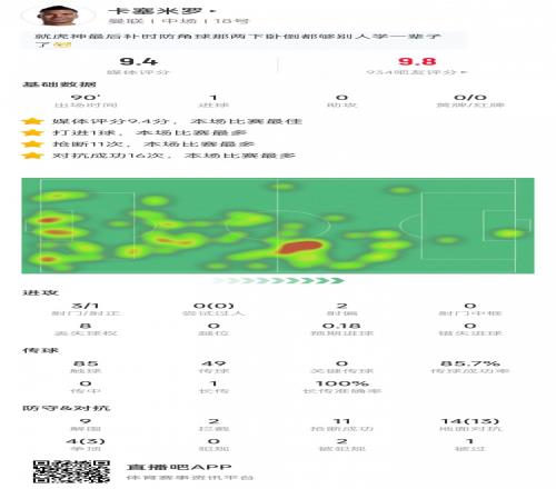 戰神表現!卡塞米羅當選曼聯vs布倫特福德全場最佳球員 英超官網 2026-04-28 07:24:07 體育播報4月28日宣 英超第34輪比賽,曼聯主場2-1擊敗布倫特福德。此役卡塞米羅為曼聯踢滿全場,打進一球,他當選英超官方本場比賽最佳球員。卡塞米羅本場數據:出場時間——90分鐘進球——1射門——3(射正1)射偏——2丟失球權——8預期進球——0.18觸球——85傳球——49傳球成功率——85.7%長傳——1(準確率100%)解圍——9攔截——2搶斷成功——11地面對抗——14(成功13)爭頂——4(成功3)被犯規——2被過——1媒體評分——9.4 足球免費觀看_英超免費觀看_曼聯免費觀看_足球高清在線_英超高清在線_曼聯高清在線 足球 英超 曼聯 布倫特福德 上一篇: 近20年首人!卡塞米羅英超單場搶斷11次+對抗成功16次+解圍9次 下一篇: 舍什科:卡塞米羅像工作機器,他離開前最后一分鐘都會好好利用他