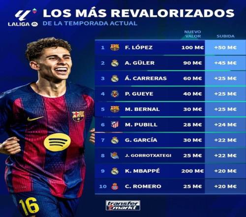 北京時間4月28日,德轉列出了本賽季西甲球員身價漲幅前10,費爾明-洛佩斯暴漲5000萬歐元排名第一,居萊爾身價上漲也達到了4500萬歐元位列第二。