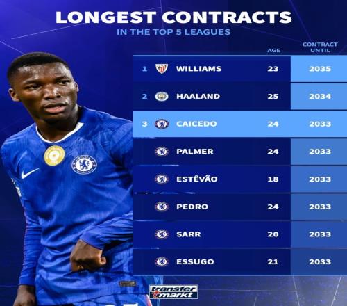 五大聯(lián)賽最長合同榜:尼科威廉斯、哈蘭德前2,切爾西6人上榜