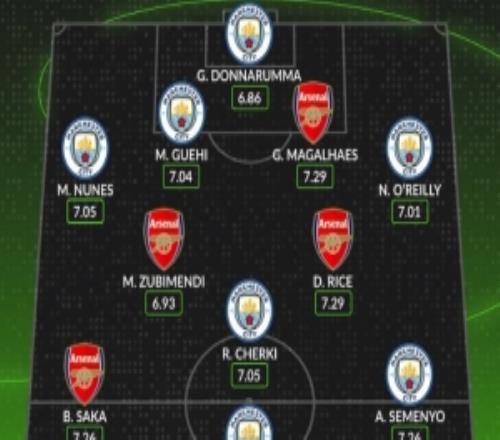 曼城+阿森納本賽季英超評分最高陣:哈蘭德領銜曼城7人,賴斯在列
